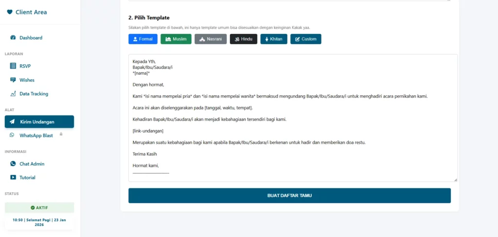 Kabar baiknya, penggunaan template undangan digital interaktif zaman sekarang sudah sangat mendukung efisiensi ini. Platform seperti Inv Akaddigitech memungkinkan Anda membuat link khusus yang mencantumkan nama tamu di halaman depan undangan. Hal ini memberikan efek psikologis bahwa undangan tersebut memang dibuat khusus untuk mereka, meskipun Anda mengirimnya lewat pesan singkat.